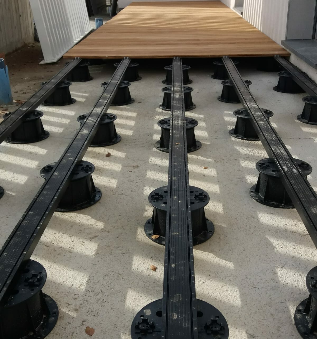 In queste immagini si vede nella caratteristica posa flottante, sopraelevato su piedini, ideale per il drenaggio dell’acqua, il rispetto delle pendenze necessarie nei pavimenti esterni.