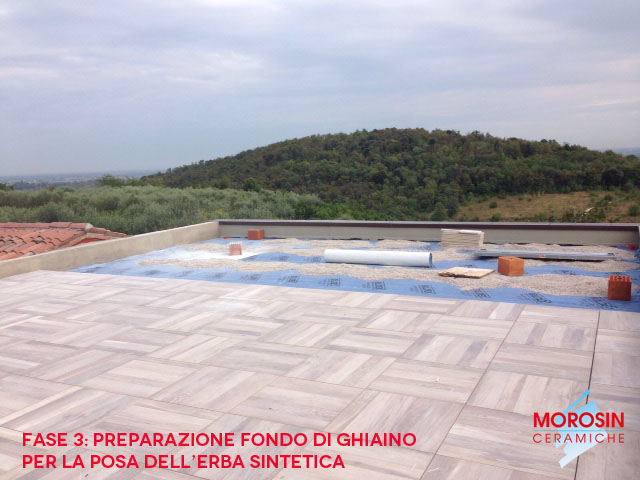 Nel lato verde del terrazzo si stende con cura il ghiaino e si adagiano i rotoli di erba sintetica; più idonea al luogo perchè richiede una manutenzione più facile.